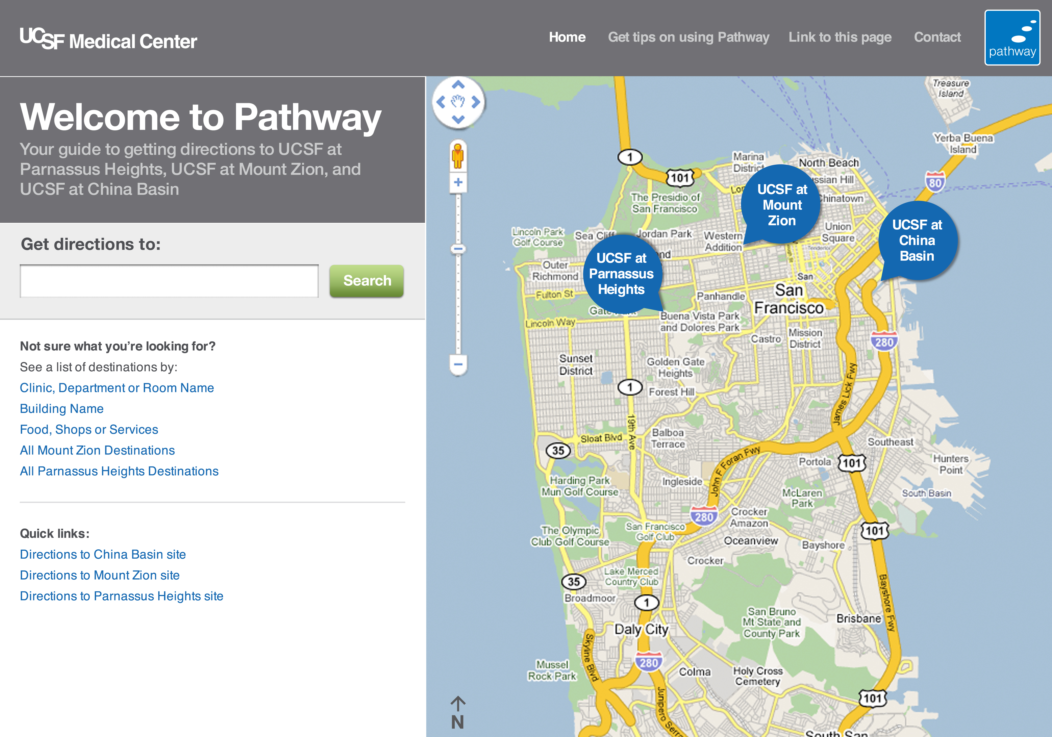 The University of California San Francisco Medical Center commissioned fd2s to design and implement one of the largest integrated wayfinding solutions to date. The new wayfinding system consists of interior and exterior signs, printed maps, and staff training materials, maintenance processes — and the cornerstone of the project is a wayfinding website and a network of on-campus touchscreens to provide directions (driving, parking and walking) to all destinations on two campuses.