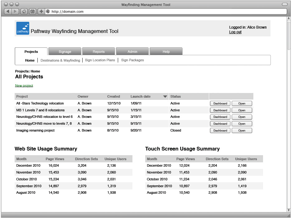 All wayfinding content is centralized in a web-based administrative tool that also manages the physical sign system.