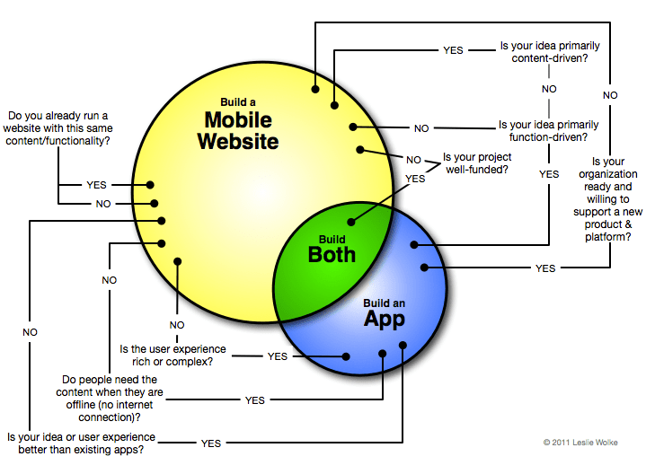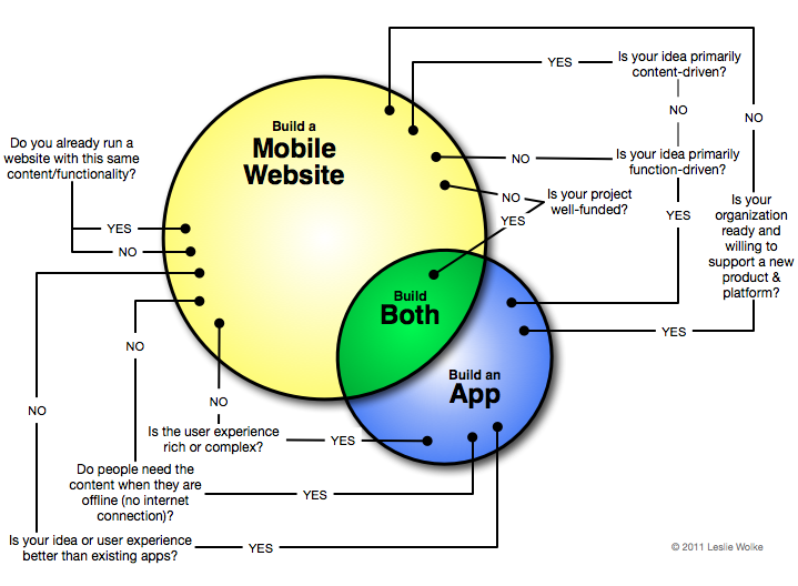 I don’t claim that the diagram below can be used as a Magic 8-Ball to derive the correct answer for your project, but it conveys my thinking when I’m asked to address the question. If you answer all the questions and follow each track into the Venn diagram, the majority of answers may lead you to a starting point for further exploration. With so much buzz about apps, it can be difficult (or at least unpopular) to make a case against them, but you can see that my bias is toward mobile editions as a first step to serve the mobile market.