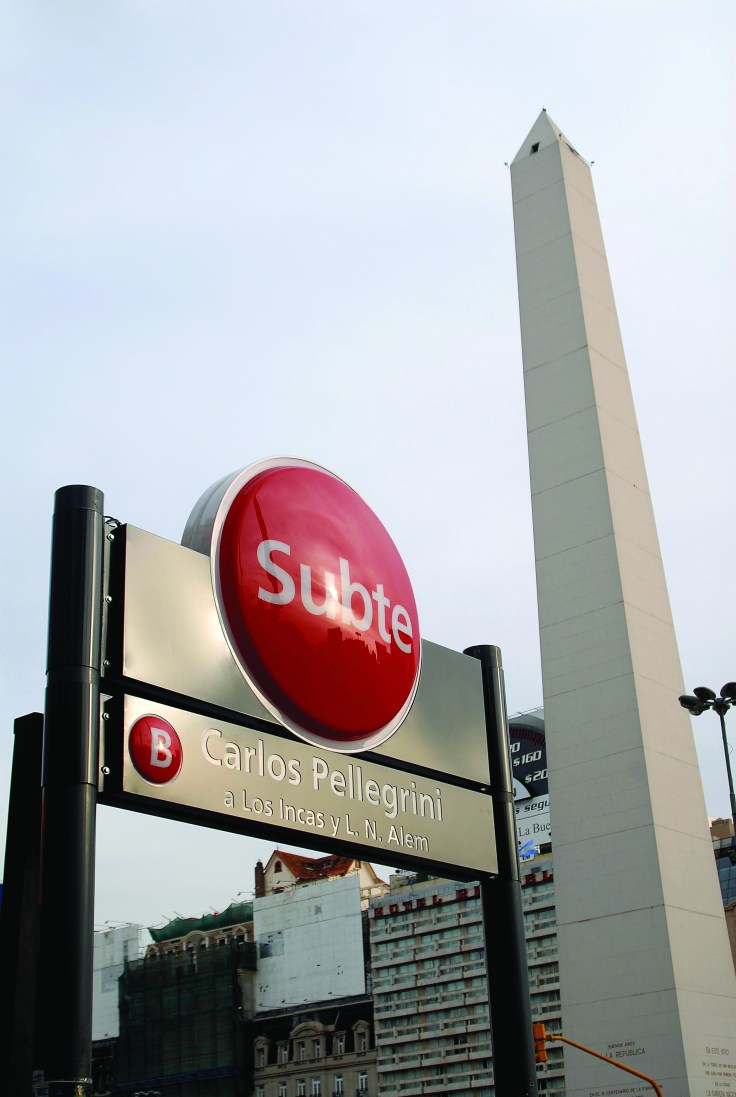 The Shakespear team chose to adapt the visual design elements used in the interior signage, reassembling them in the grand scale required to identify stations on Buenos Aires’ busy streets and wide boulevards. The circle that identified the various lines on interior signage was made three dimensional and illuminated to become a recognizable beacon hovering above the streetscape. The cylindrical caps were rotated to become pillars supporting the spherical landmark. This economy of design appears effortless, as if it were the only logical conclusion to the design problem at hand.