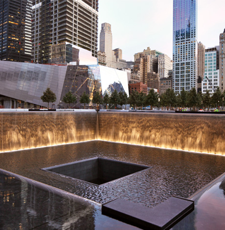 From his earliest sketch to the fully realized incarnation, Arad envisioned Reflecting Absence as a plaza framing the two sunken pools that articulate the footprints of the towers. Streaming down the granite-clad walls from each side is a curtain of water, bathing the plaza with a constant of sound of rushing water. From the bottom of the waterfalls, the water drifts toward the center where it drops into what appears to be a bottomless chasm.