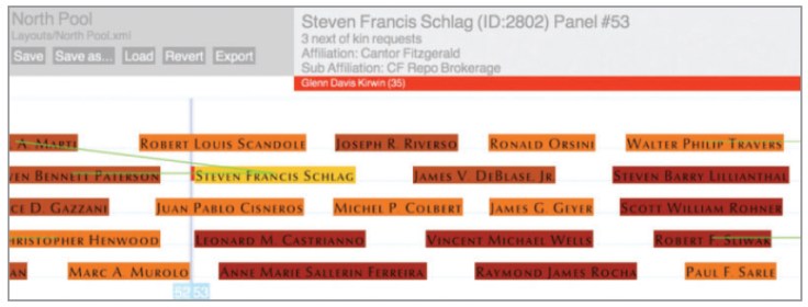 Local Projects created a drag-and-drop software tool that tracked each request and maintained a tally of how close any composition came to fulfilling every adjacency request. Users of the tool could “pick up” a name, place it in a new location among the rows and panels, and see whether a given move improved or reduced the percentage of met requests.